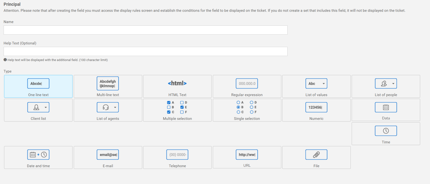 After creating the field, go to the Display Rules screen to define the display conditions on the ticket. Without an associated rule, the field will not be displayed.