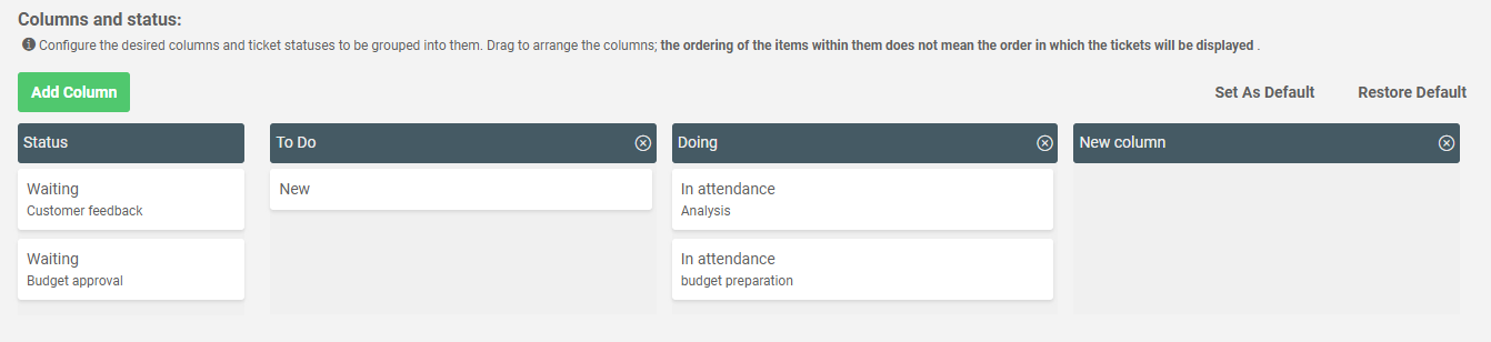 In this section, you can select and organize the columns that will be displayed in the view. By default, three columns will be created: Status, To Do, and In Progress.