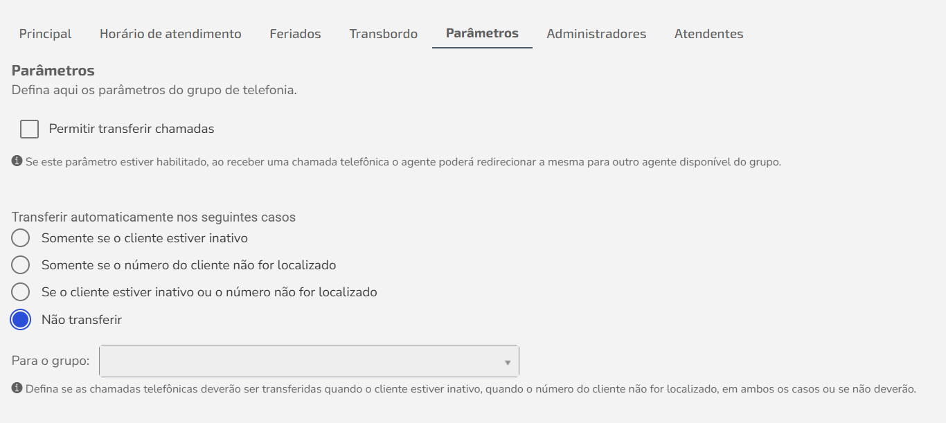 - Automatic forwarding to another group: You can set up automatic call forwarding to another group in cases such as: the customer is inactive; the customer's number was not found; or both. You can also disable automatic forwarding if preferred.