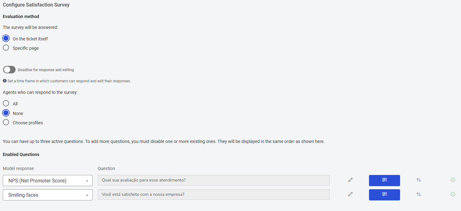 💡Tip: You can have up to three active questions. To add more questions, disable one or more existing ones. They will be displayed in the same configured order.