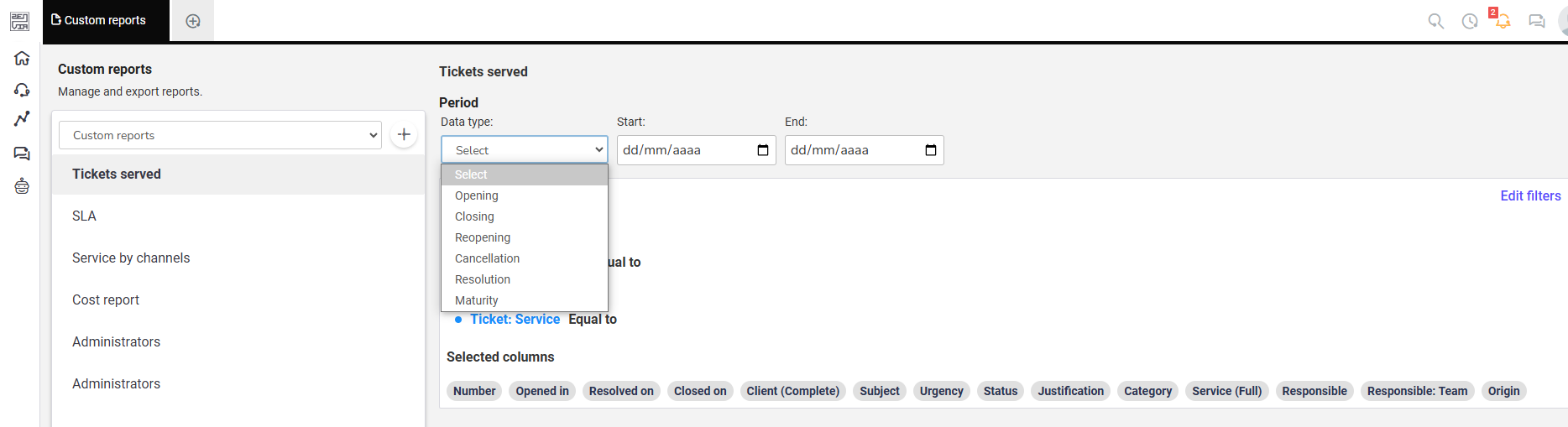 To ensure that only relevant tickets are exported, use the Period filter. This filter defines the time range for ticket analysis, allowing you, for example, to export only those that were resolved, opened, or modified within a specific period.