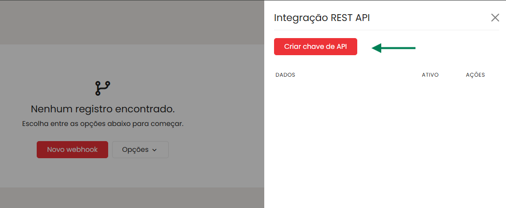 2. Find the API option. To do this, go to the side menu Platform > API and Webhooks > REST API Integration (Plataforma > API e webhooks > Integração REST API).