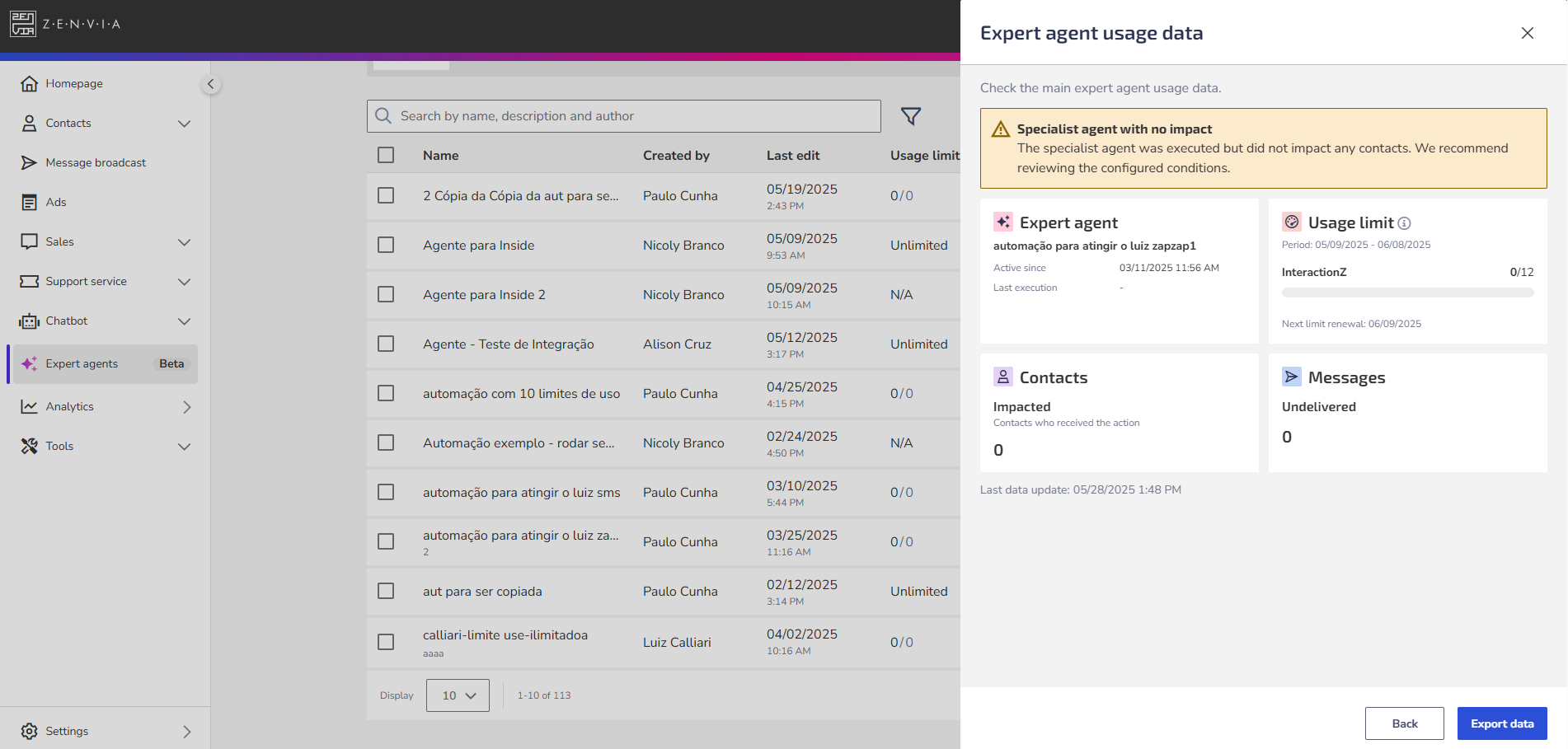 This feature displays the data for each expert agent. Here, you can view, analyze, and export the data for each expert agent. This information supports decision-making and planning the next steps regarding expert agent and the impacted contacts (customers). Usage statistics will be available in expert agent whenever the execution value is greater than zero.
