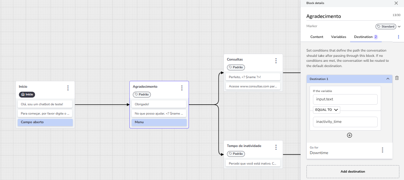Click Add destination and create a condition. Imagine you're saying: "IF the idle timeout ends (the variable input.text IS EQUAL TO inactivity_time), THEN go to the 'Idle Timeout' block."