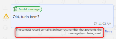 The contact's registration contains incorrect information that prevents the message from being sent. Please check and correct the information in the registration. | Correct the contact's details, such as name, phone number, and email, as there are invalid data (e.g., nonexistent number or incorrect email). To correct the contact's registration: Go to Contact Base, click on the contact's name, and select Edit details. |