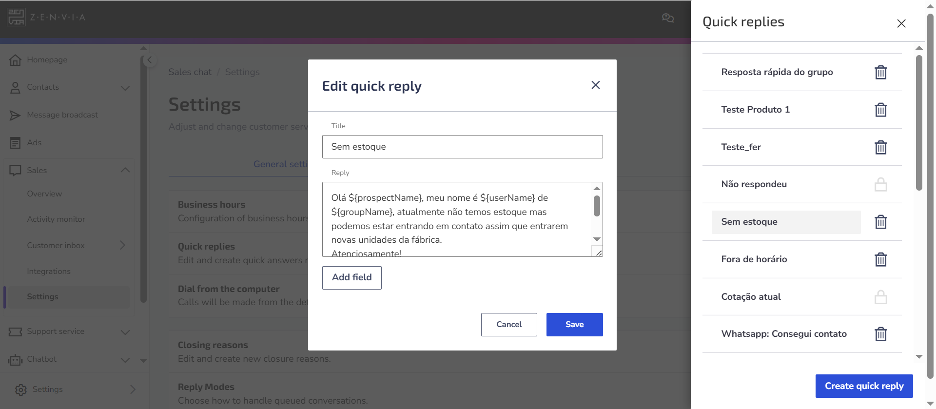 - Go to Sales > Settings > General settings > Quick replies.