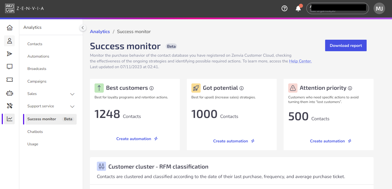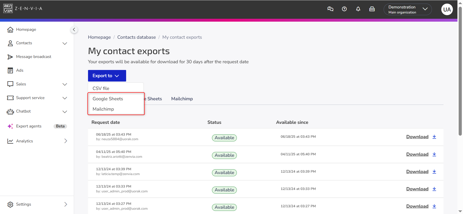 - Export your contacts from Zenvia Customer Cloud for analysis or external use.