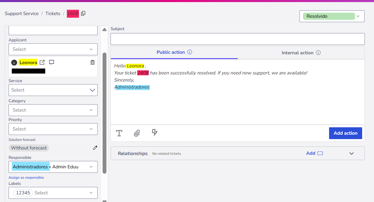 Your ticket {ticket.id} has been successfully resolved. If you need new support, we are available!