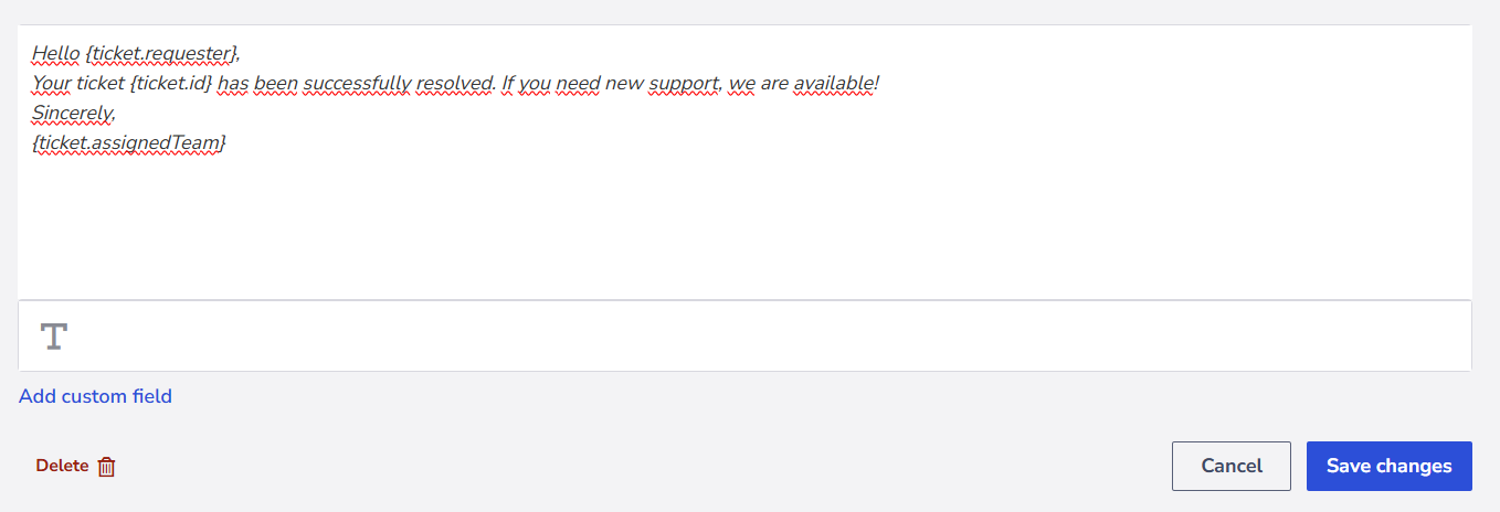 | Define action description | Automatically inserts text into the body of the action, which may include **custom fields** and text formatting. ⚠️ Attention: After applying the model, the agent must confirm the saving of the action in the ticket. |