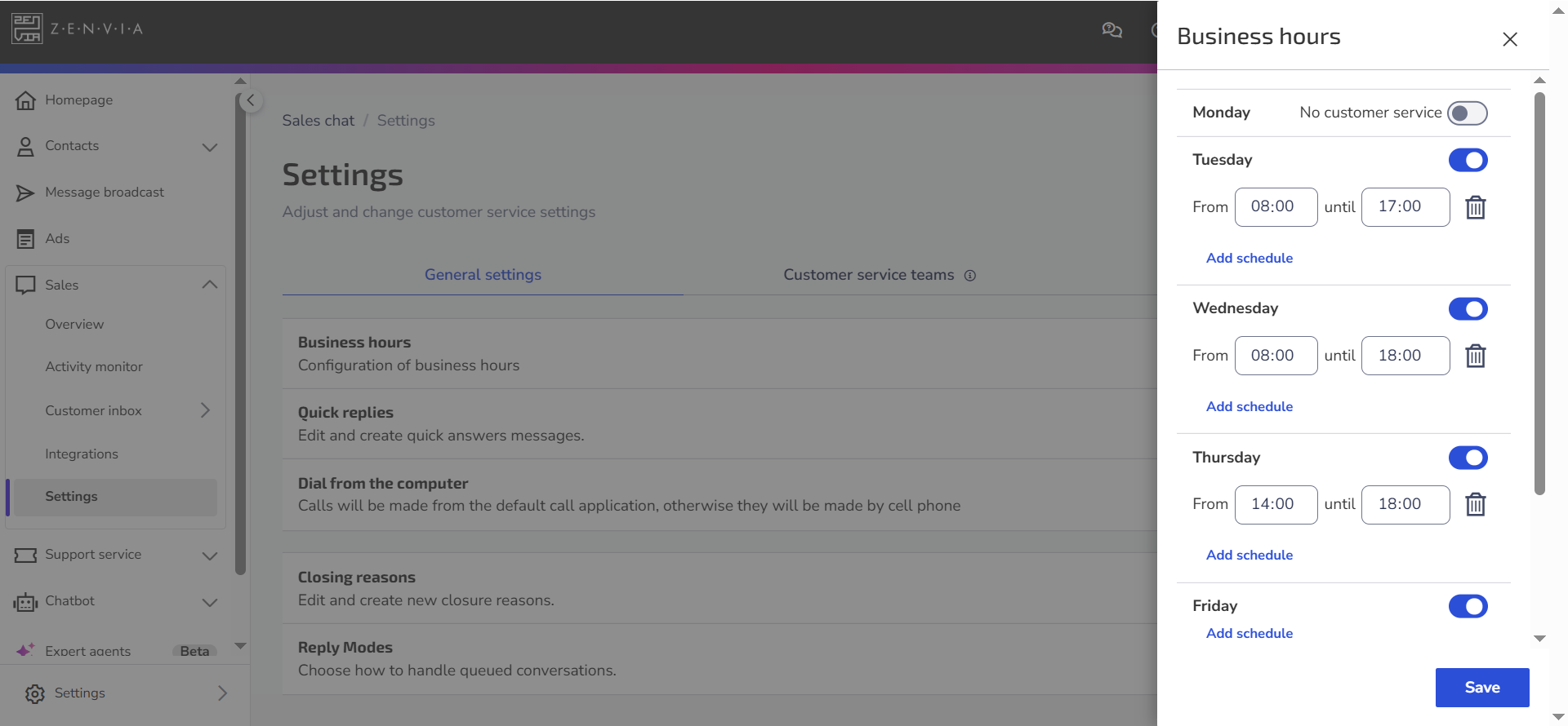 Learn how to set up business hours in Zenvia Customer Cloud, including weekdays and start and end times for the shifts.