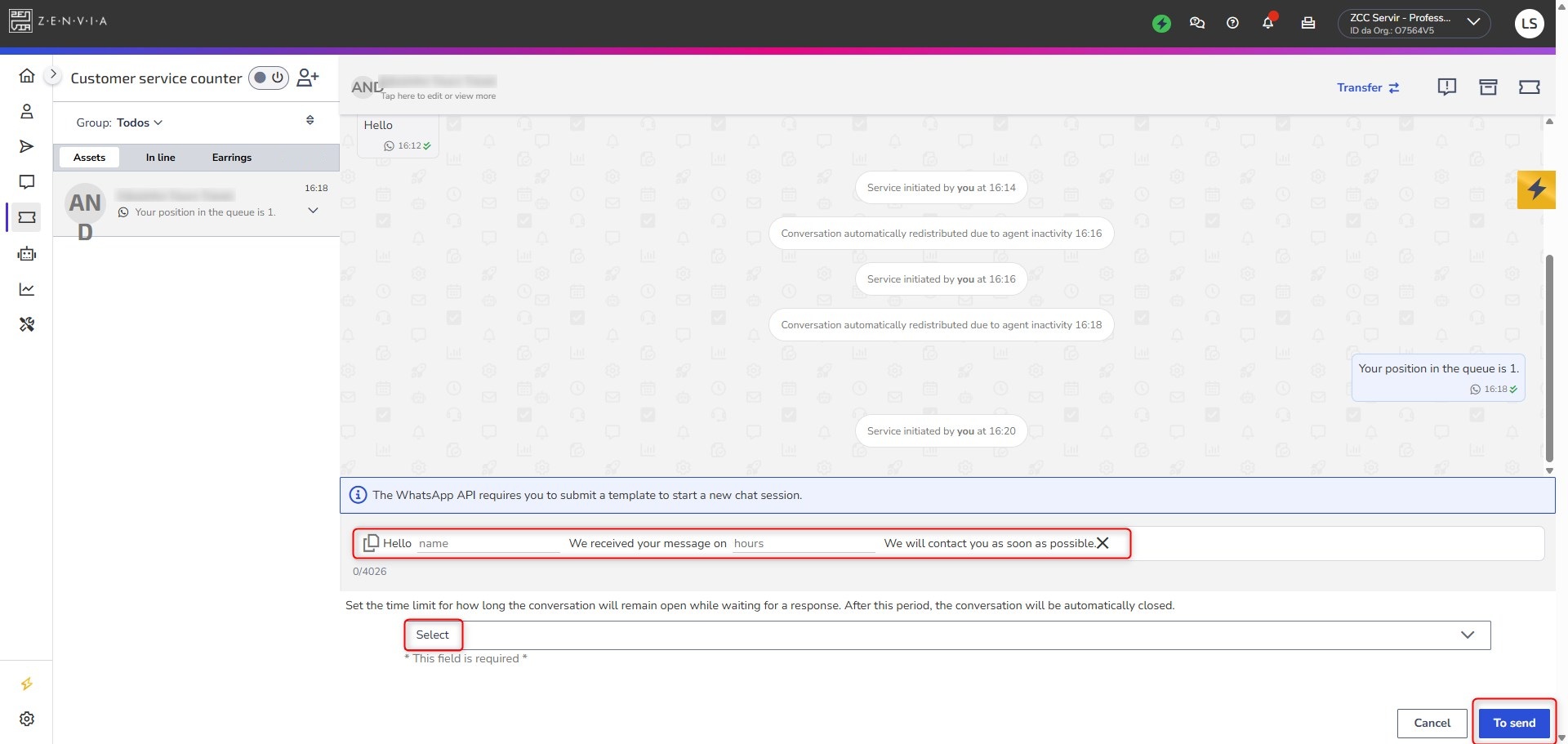- If no template is configured for the WhatsApp number, the message cannot be sent and the support interaction cannot continue through this channel.