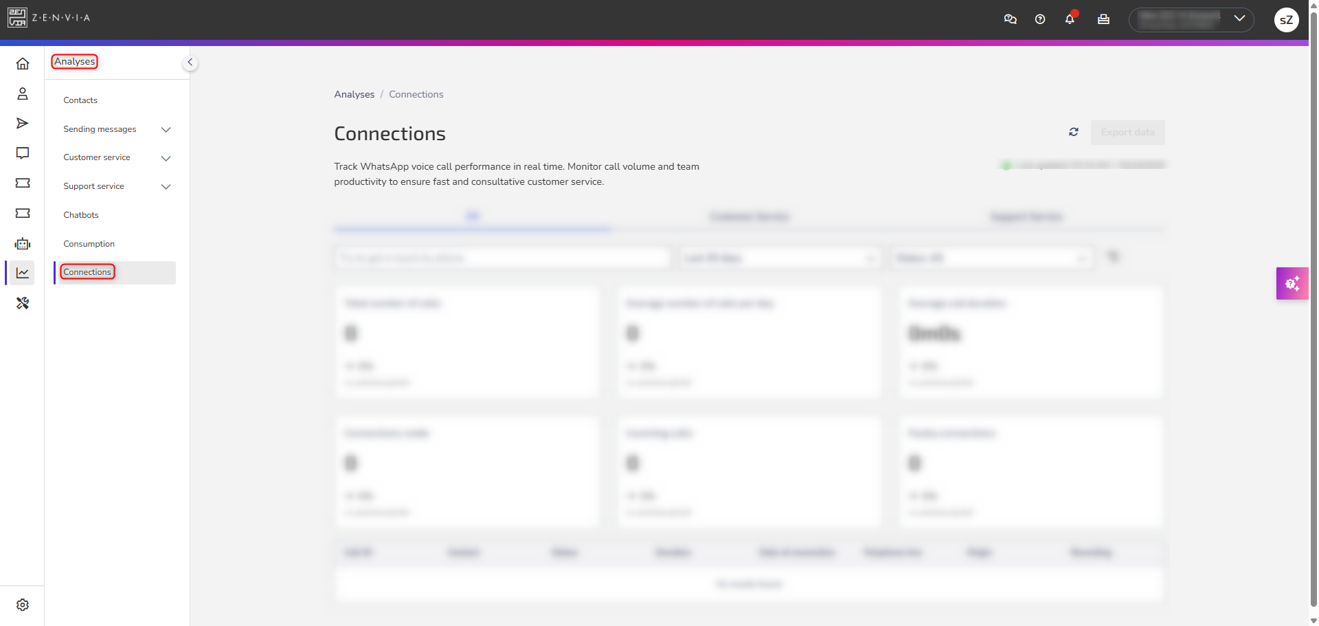 The WhatsApp calls report allows you to track consolidated information about voice calls made and received through WhatsApp in Zenvia Customer Cloud.