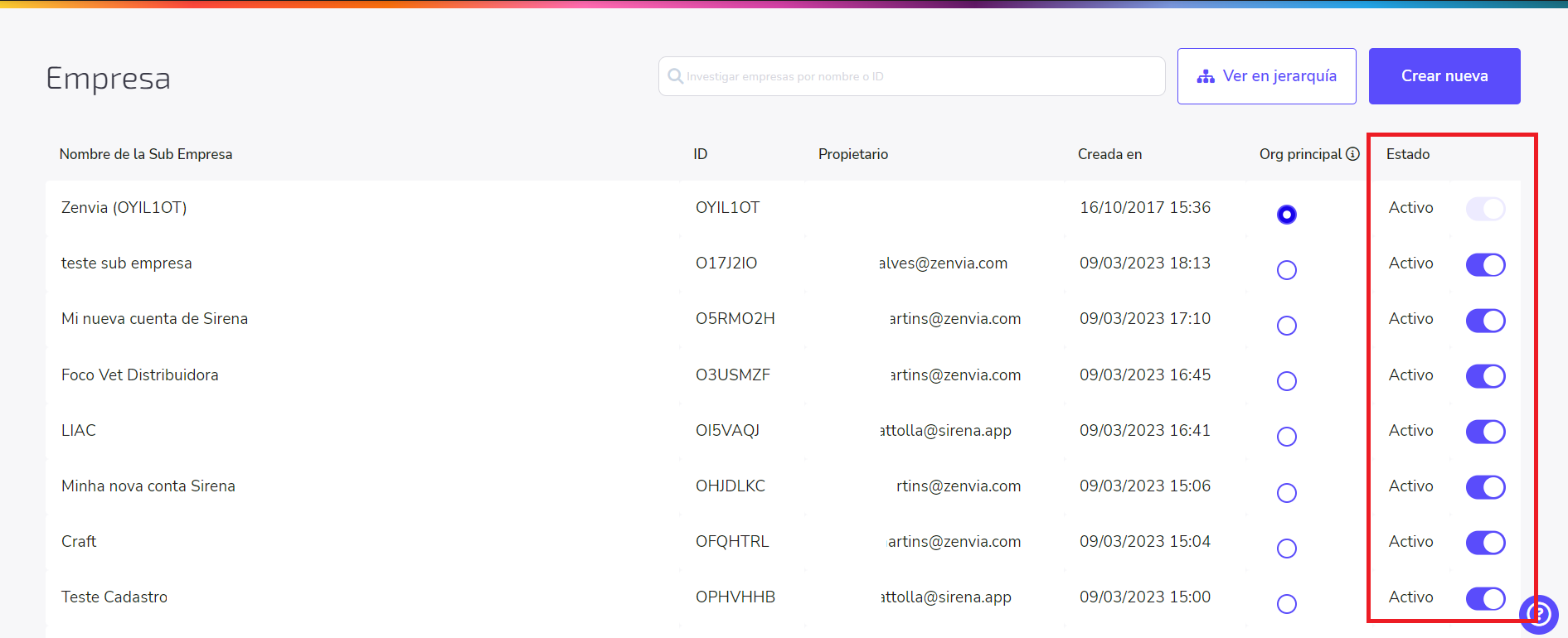 ⚠️ Atención: Solo el creador de la organización/suborganización y usuarios con perfil Administrativo pueden desactivarla. No es posible desactivar la organización principal, registrada en el momento de la creación de la cuenta.