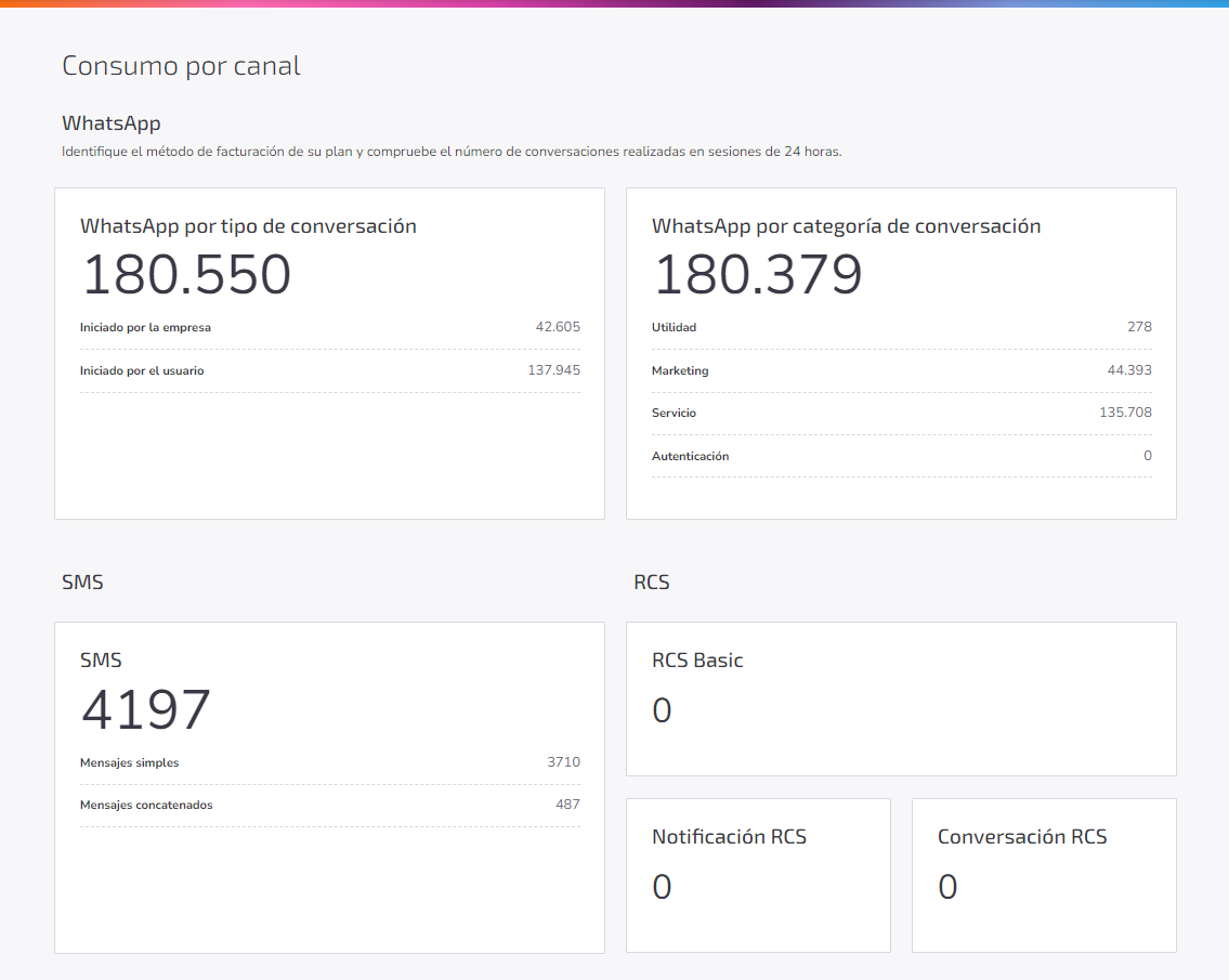 Con esta información, puede realizar un seguimiento de la cantidad de mensajes enviados a través de los canales y herramientas de Zenvia que ha contratado.