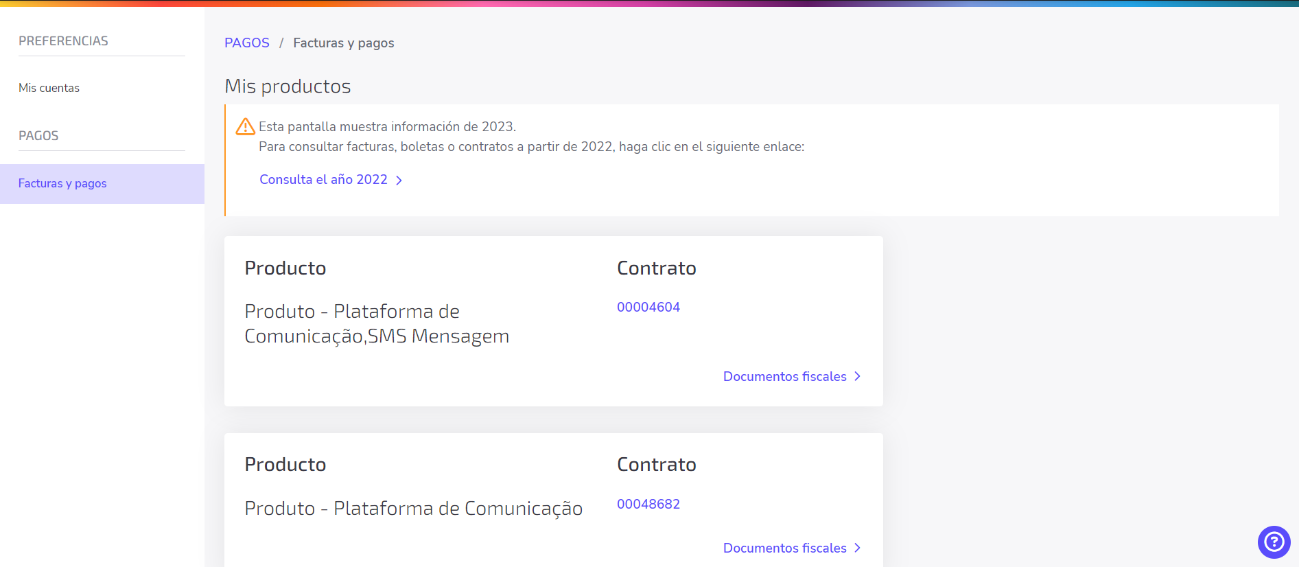 2. Para ver sus pagos, vaya a Facturas y pagos. Al hacer clic en Facturas y Pagos, si solo tiene un producto, los documentos se cargan automáticamente. Si tiene más de uno, debe hacer clic en el contrato.