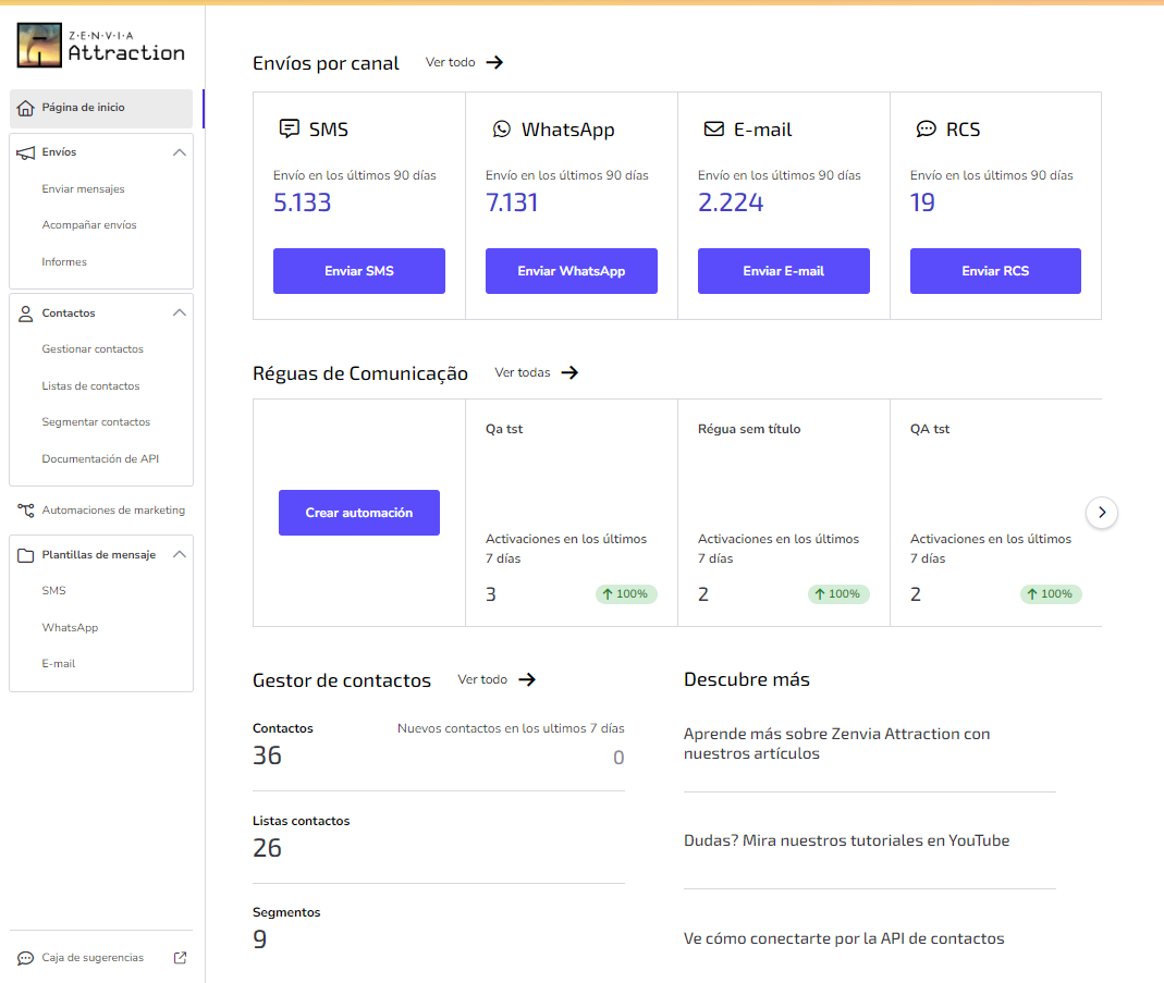 Al entrar en Zenvia Attraction, encontrarás nuestra pantalla inicial, que presenta un vistazo general de las funcionalidades del producto.