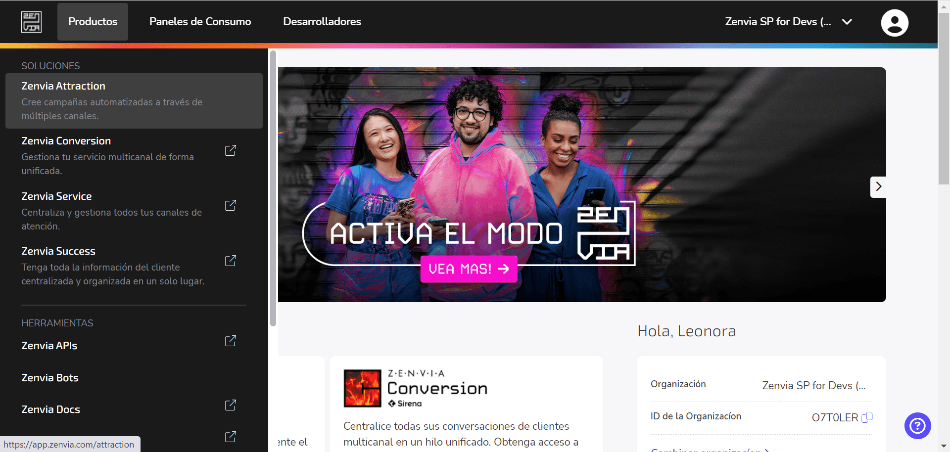 • Haz clic en el menú Productos y selecciona la opción Zenvia Attraction;
