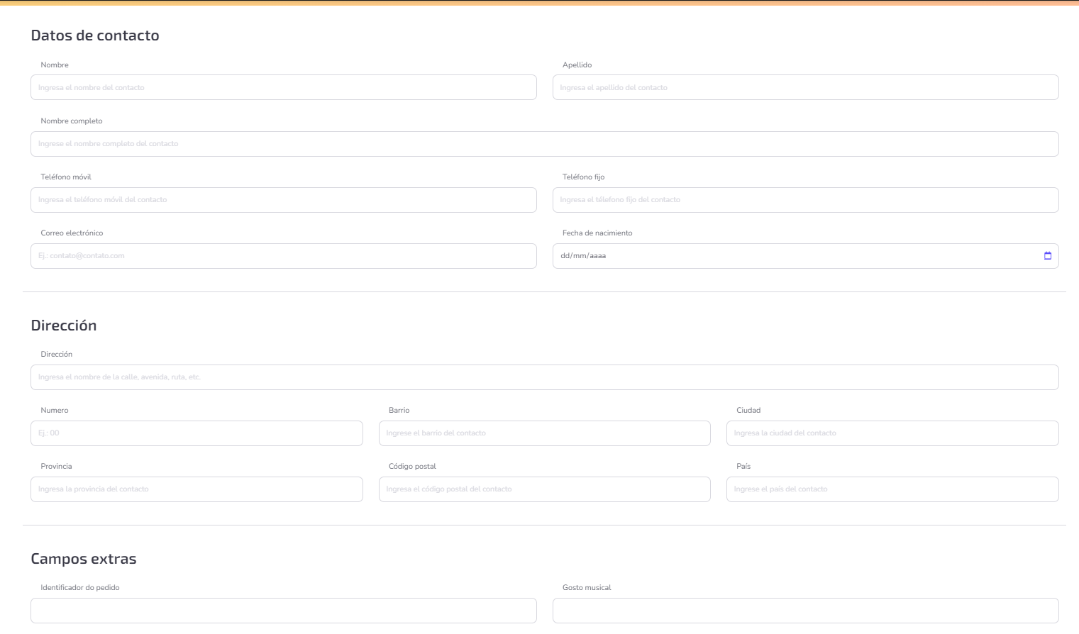 ⚠️ Atención: Es obligatorio registrar el teléfono celular o el correo electrónico y vincular el contacto a una o más listas (el sistema siempre impedirá la adición si faltan estos datos). El teléfono debe registrarse en el formato DDI+DDD+número. Por ejemplo, para números de Argentina, siempre debe incluirse el número 9 entre el código del país y el código de área, por lo tanto, sería así: 549+DDD+XXXXXXXX, sin espacios ni guiones. Consulta los códigos DDI de los países de América Latina: