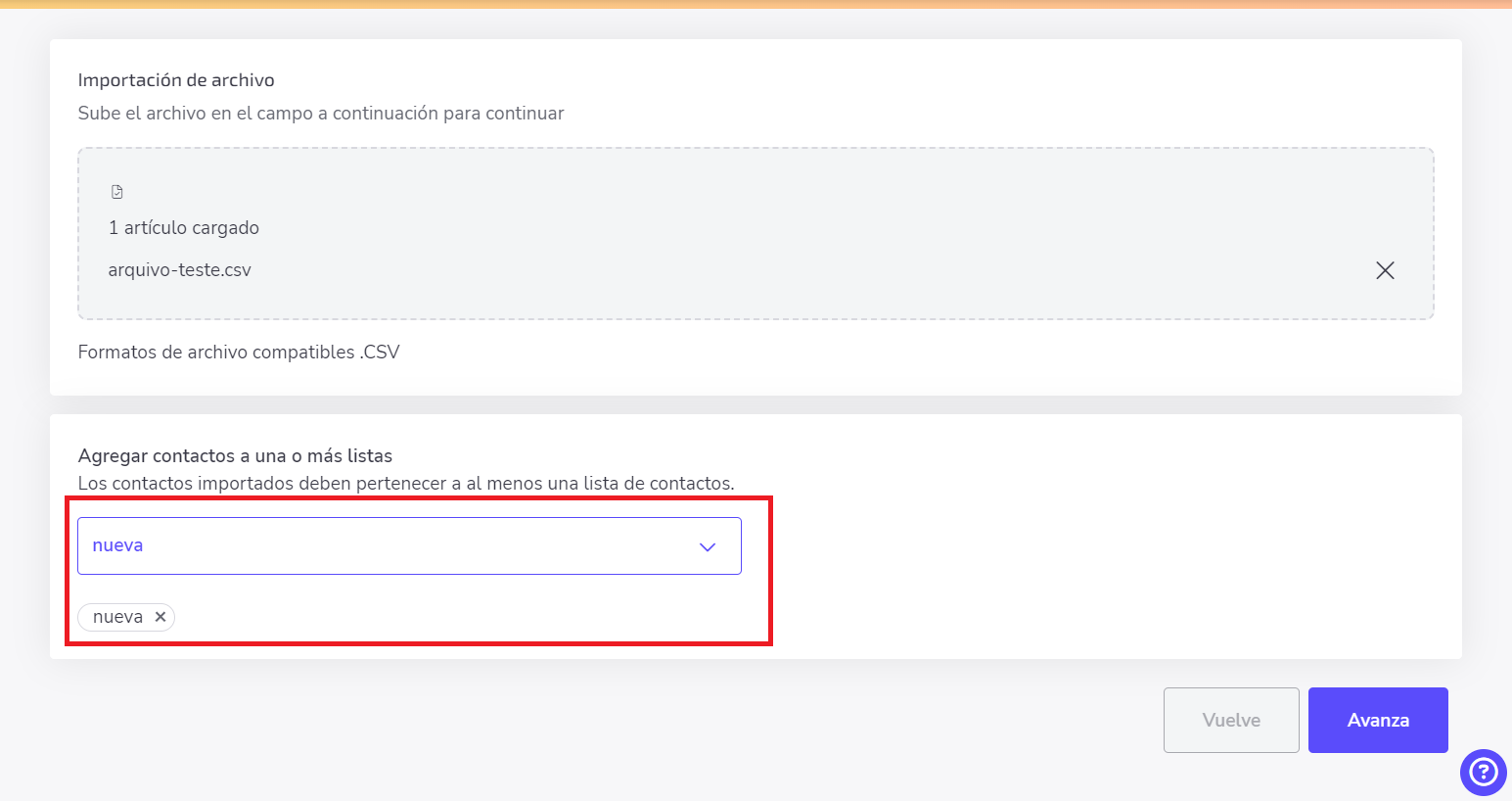 ⚠️ Atención: para incluir contactos, debes crear una lista o utilizar una que ya exista. En el ejemplo, seleccionamos una lista creada anteriormente.