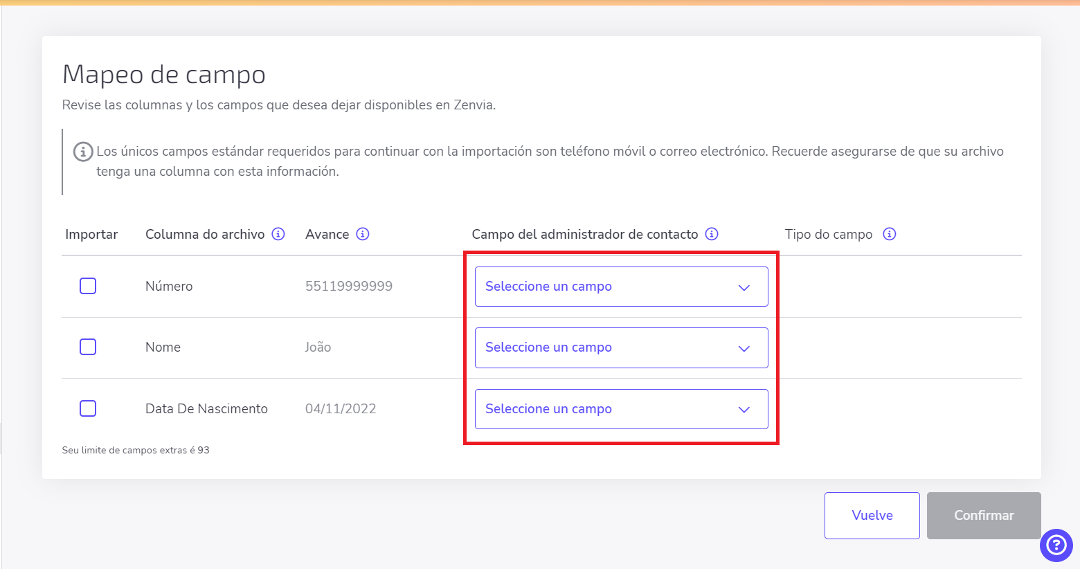 En la columna Importar, puedes seleccionar los campos que serán habilitados, o sea, cuáles serán utilizados por la lista. Si una columna llega a ser deshabilitada, el sistema no subirá los datos y la ignorará durante la importación.