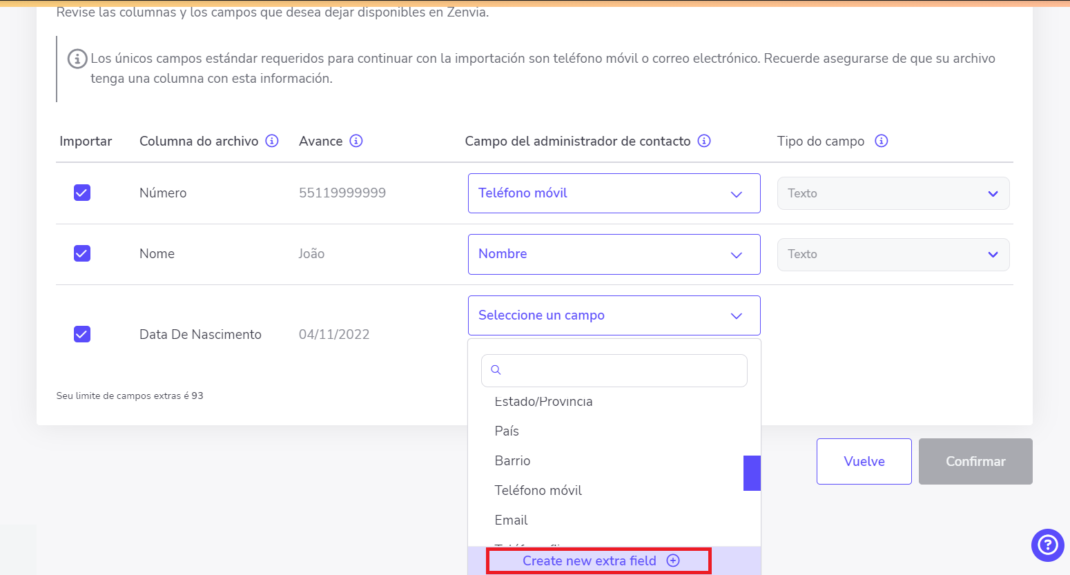 ⚠️ Atención: La creación de campos extras está disponible tan solo para contactos añadidos vía importación de archivos. El límite de creación de campos extras es 100 por organización y cada uno puede ser usado en otras importaciones.