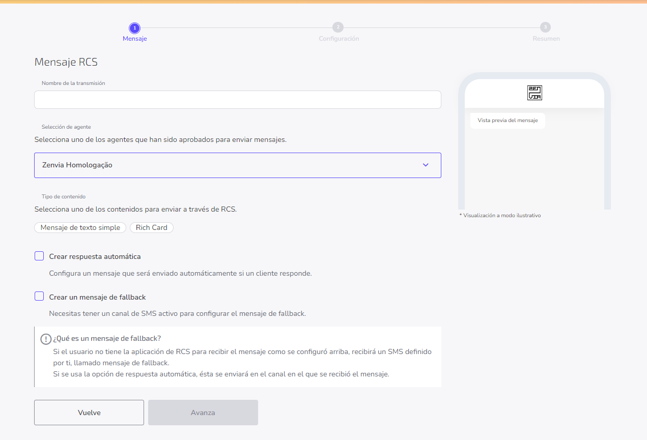 Es importante recordar que el RCS es recibido por los usuarios a través de la misma aplicación de mensajes estándar del sistema Android, Google Messages. Para otros sistemas operativos (como iOS), es necesario registrar un mensaje de respaldo (fallback). Esta funcionalidad permite enviar un mensaje alternativo a los clientes que no estén habilitados para recibir RCS en su dispositivo.