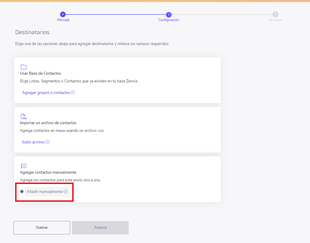 Cuando el sistema detecte que no hay variables en su texto, usted podrá elegir cualquier forma de envío en la etapa de configuración de destinatarios. Note que ninguna opción está indisponible.