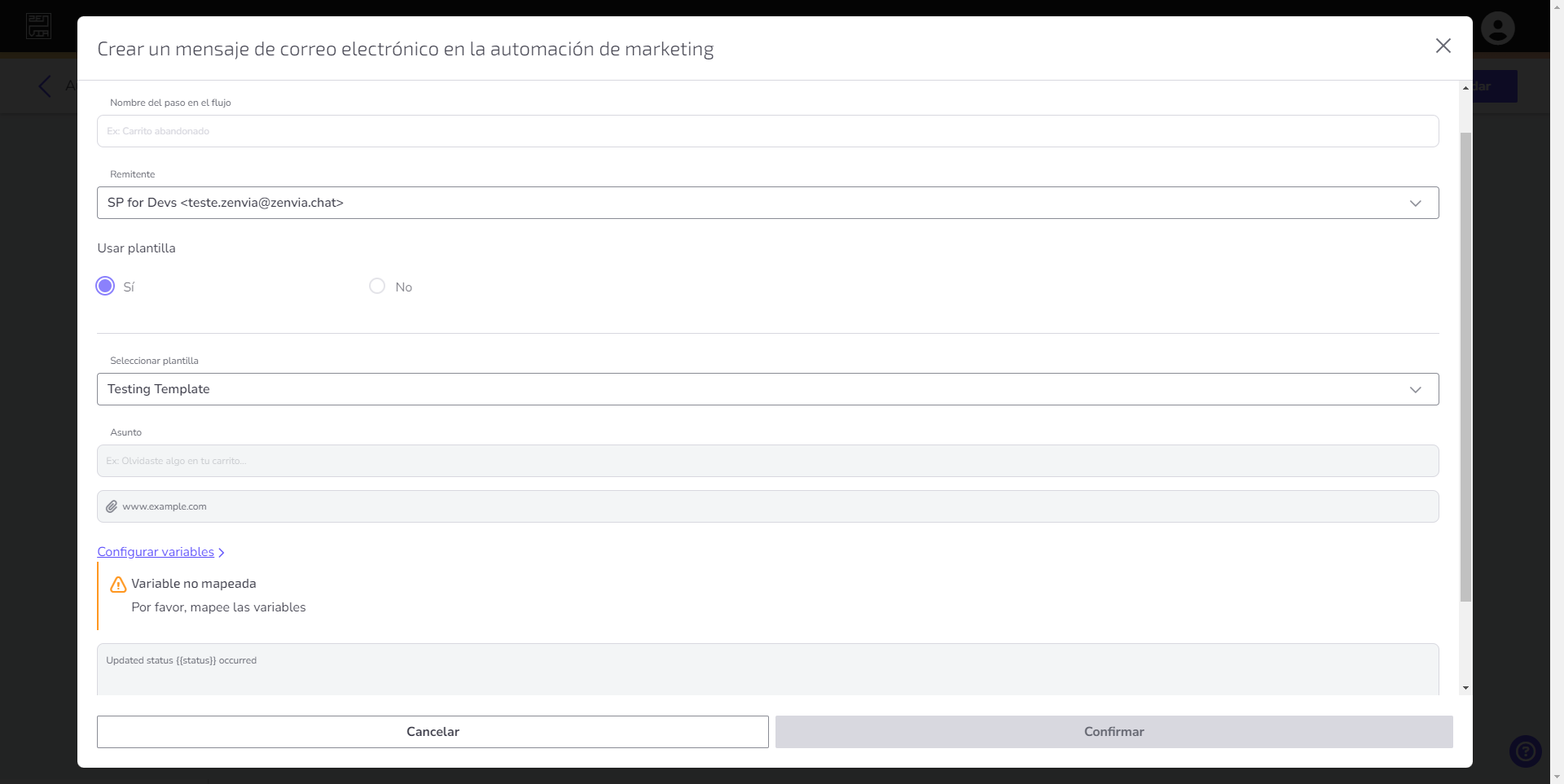 • En el enlace Configurar Variables editamos todas las variables utilizadas por el mensaje. Para hacerlo, selecciona lo que el mensaje debe representar y haz clic en Confirmar.