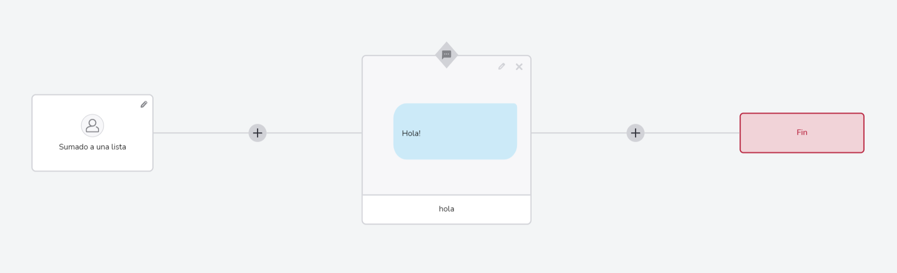 Independientemente de la forma que hayas utilizado para llegar al constructor, tu pantalla inicial muestra la regla de comunicación seleccionada y el flujo se define vinculando varias etapas entre si hasta llegar al final. Para utilizar esos bloques, utiliza las siguientes herramientas: