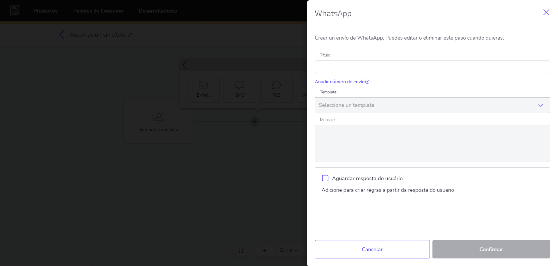 - Por fin, la opción Esperar respuesta del usuario hace que el flujo solo continúe cuando el mensaje reciba una respuesta. El sistema esperará una respuesta del usuario por 48 horas.