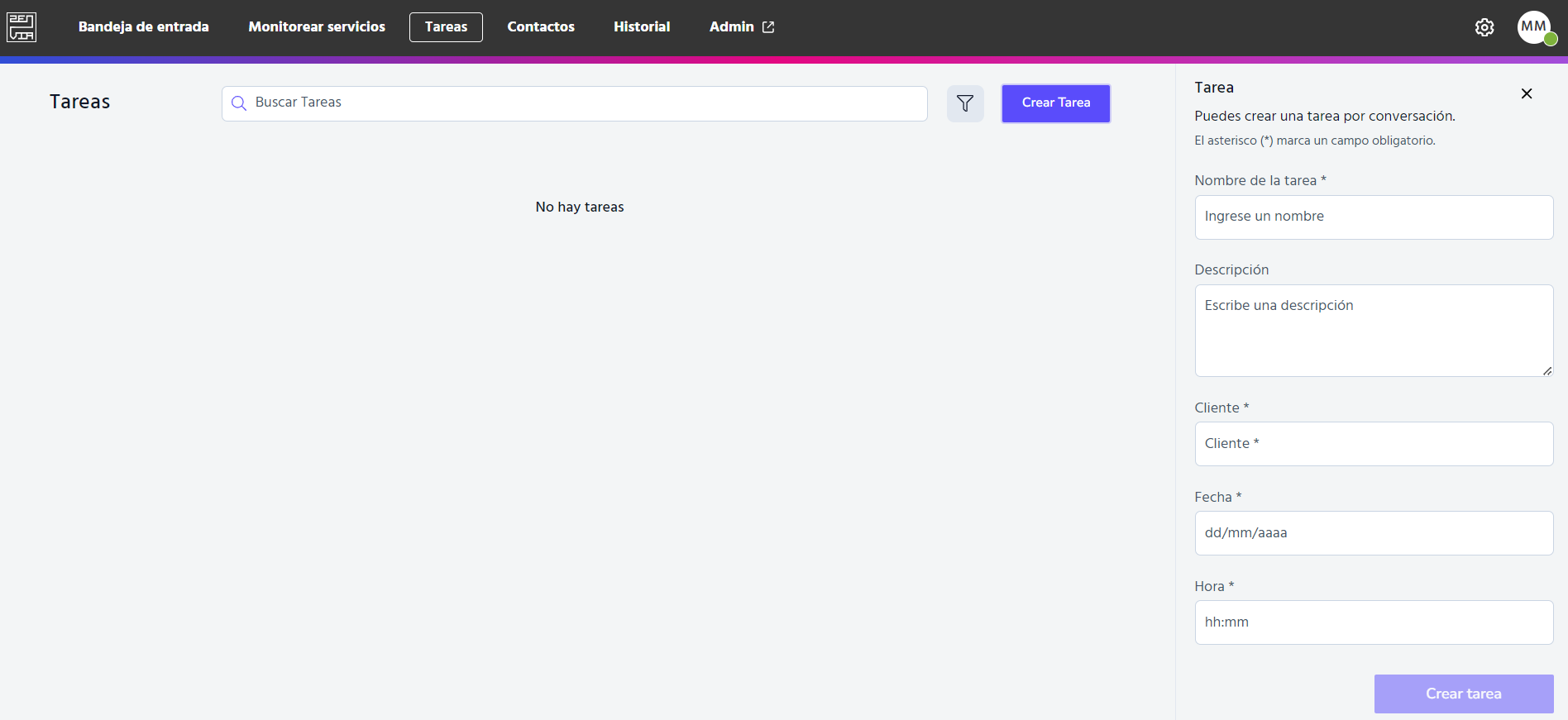 1. Para agregar una tarea, haz clic en el botón Crear tarea. Aquí necesitamos incluir el nombre del cliente asociado a la tarea. El sistema mostrará los campos a la derecha para completar la información, como se muestra en la imagen a continuación.