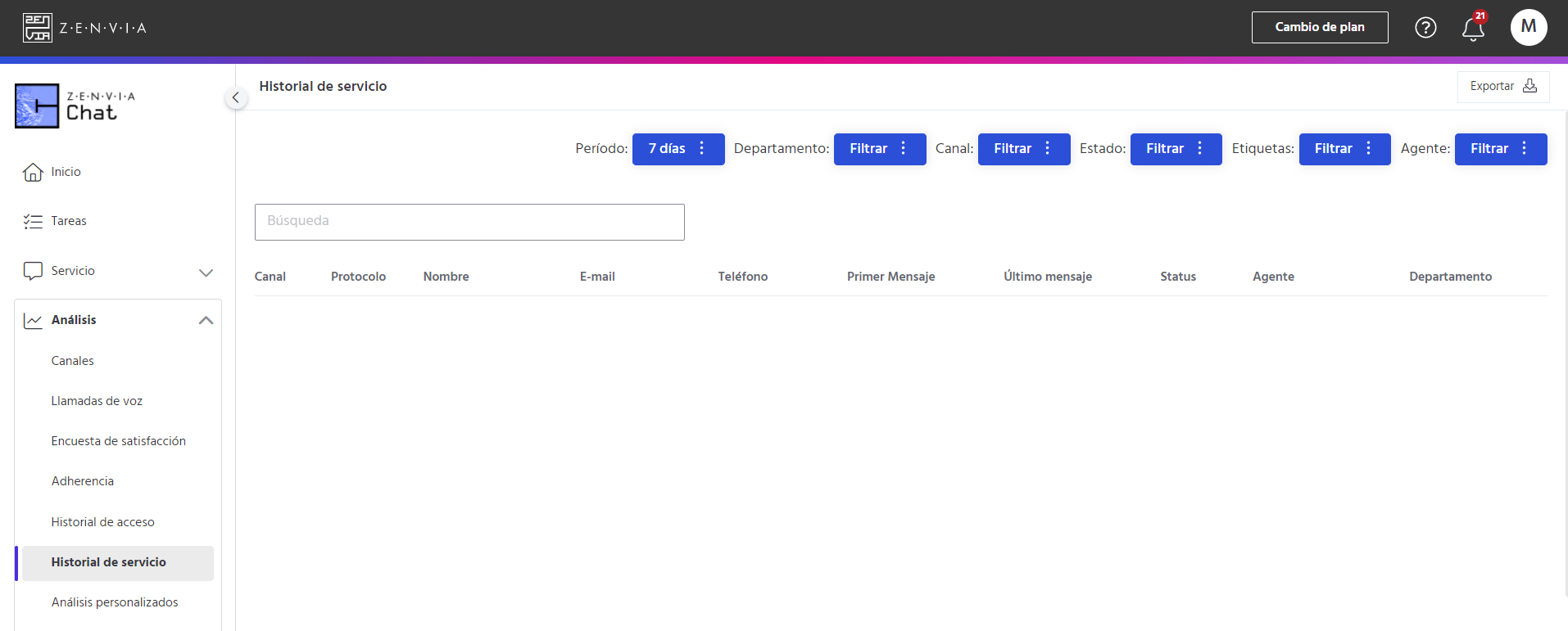 Para acceder, vaya a Zenvia Chat - Perfil de AdministradorAnálisis > Historial de Servicio.