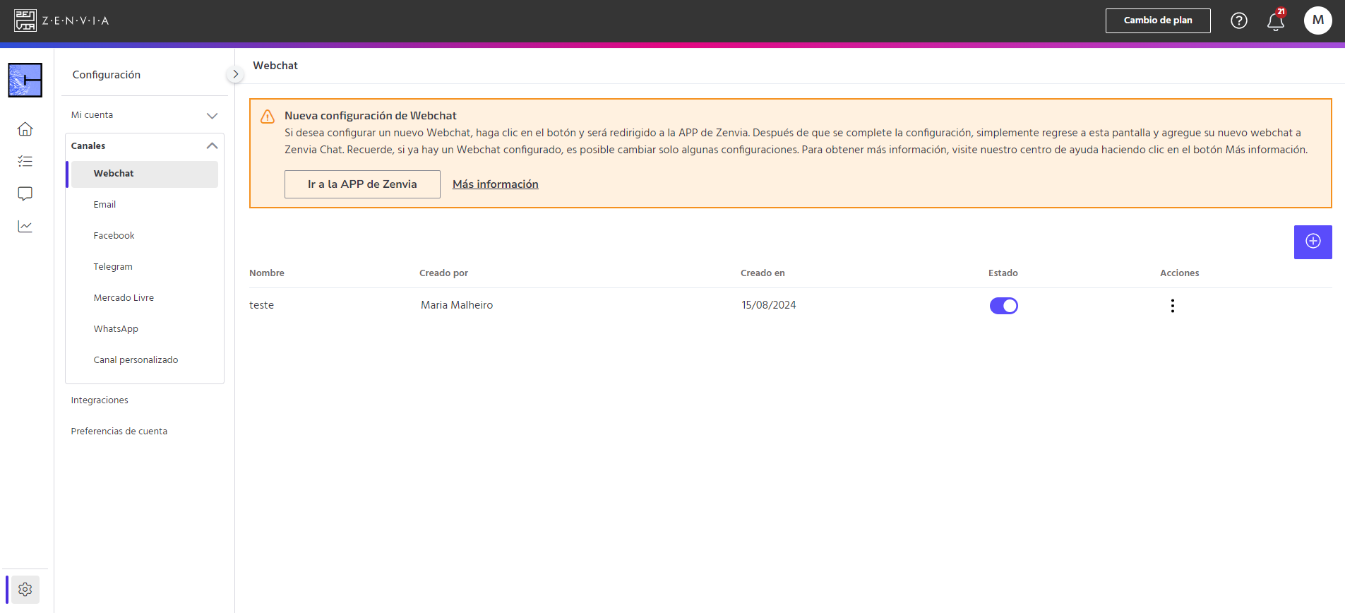 Para acceder a este canal, vaya a Zenvia Chat - Perfil de Administrador > Ajustes > Canales > Webchat.