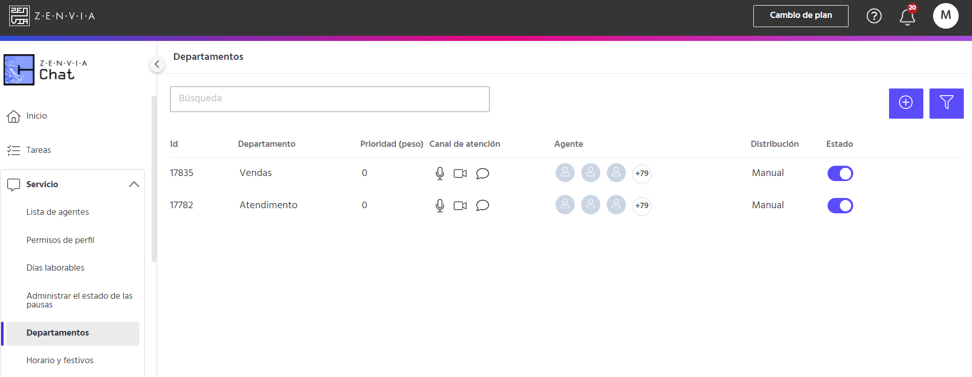 Para acceder a esta funcionalidad, vaya a Zenvia Chat - Perfil del administrador > Servicio > Departamentos.