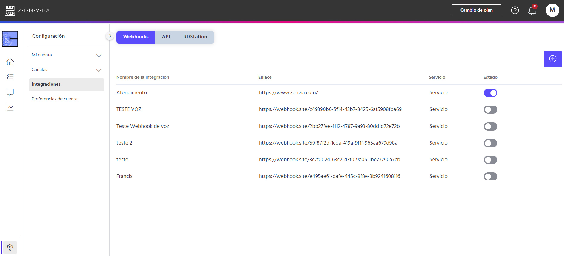Para acceder a esta funcionalidad, ve a Zenvia Chat - Perfil de Administrador > Ajustes > Integraciones > Webhook.