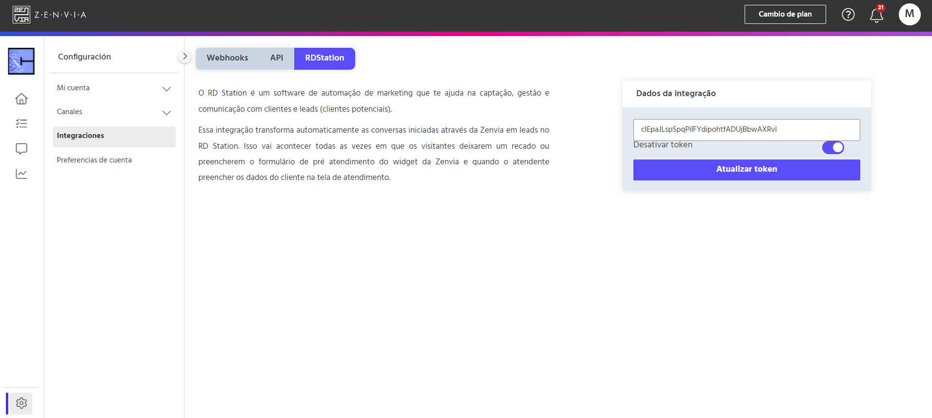 Ahora, pegue el token en Zenvia Chat y haga clic en Actualizar token. Para que los contactos se conviertan en leads en RD Station Marketing, es obligatorio que el correo electrónico del cliente esté completo en Zenvia Chat, en el área de contactos. Después de pegar el token de RD Station Marketing en Zenvia Chat, contacte a Zenvia para que configuren el sistema para obligar a los agentes a completar los correos electrónicos de los contactos.