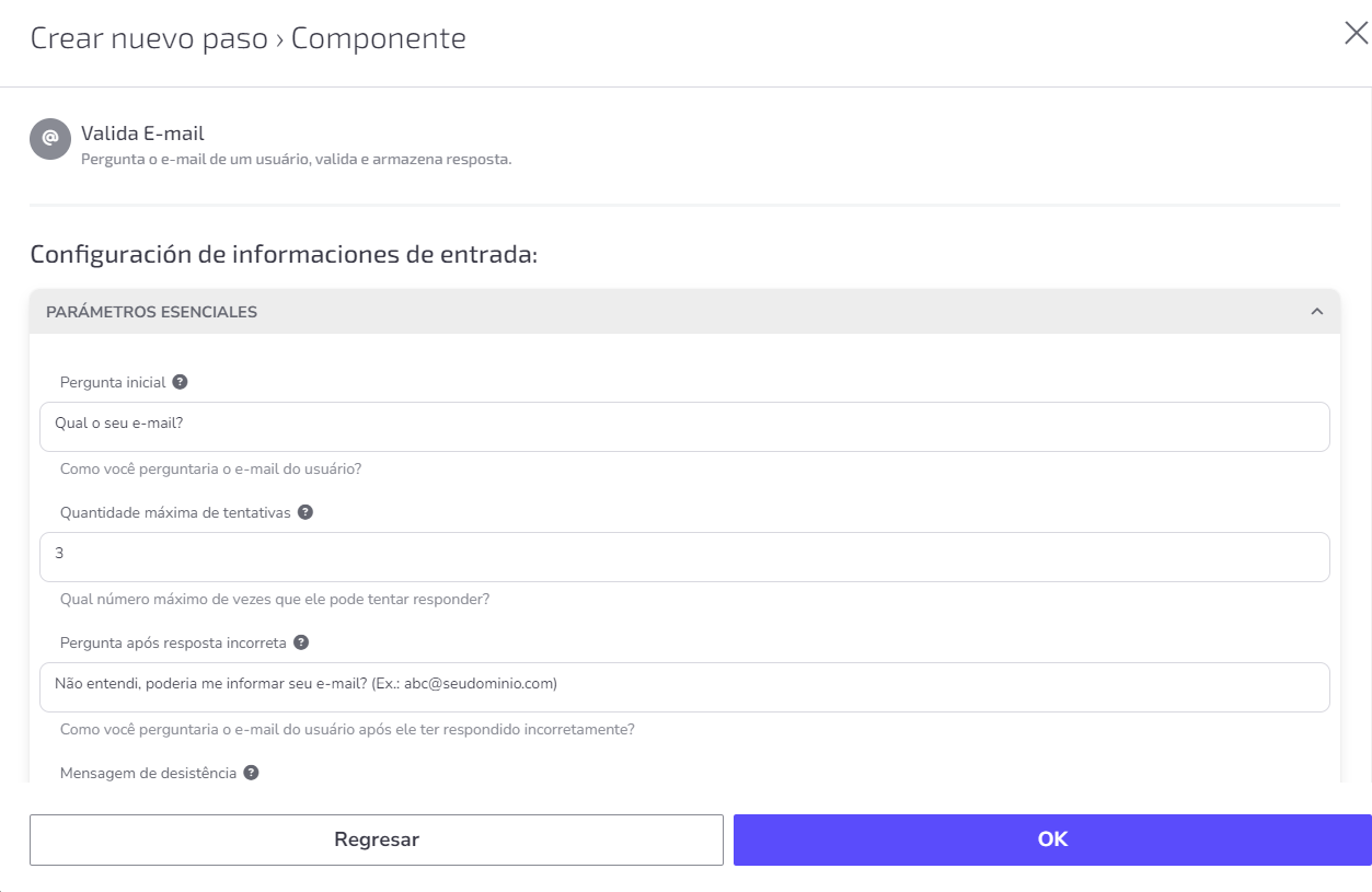 Siguiendo la tendencia en la mayoría de los casos, los campos ya están completados con una frase de sugerencia, pero puedes ajustar los mensajes y otras configuraciones para que se integren con la propuesta de tu flujo.