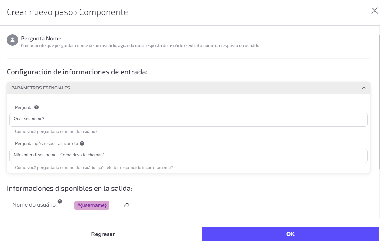 Son datos que pueden utilizarse en la continuidad del flujo, estableciendo reglas e información. Además, al utilizar el componente, no es necesario crear un Mensaje del Usuario para recopilar la respuesta, ya que el dato ya se completará en una de las variables de salida.