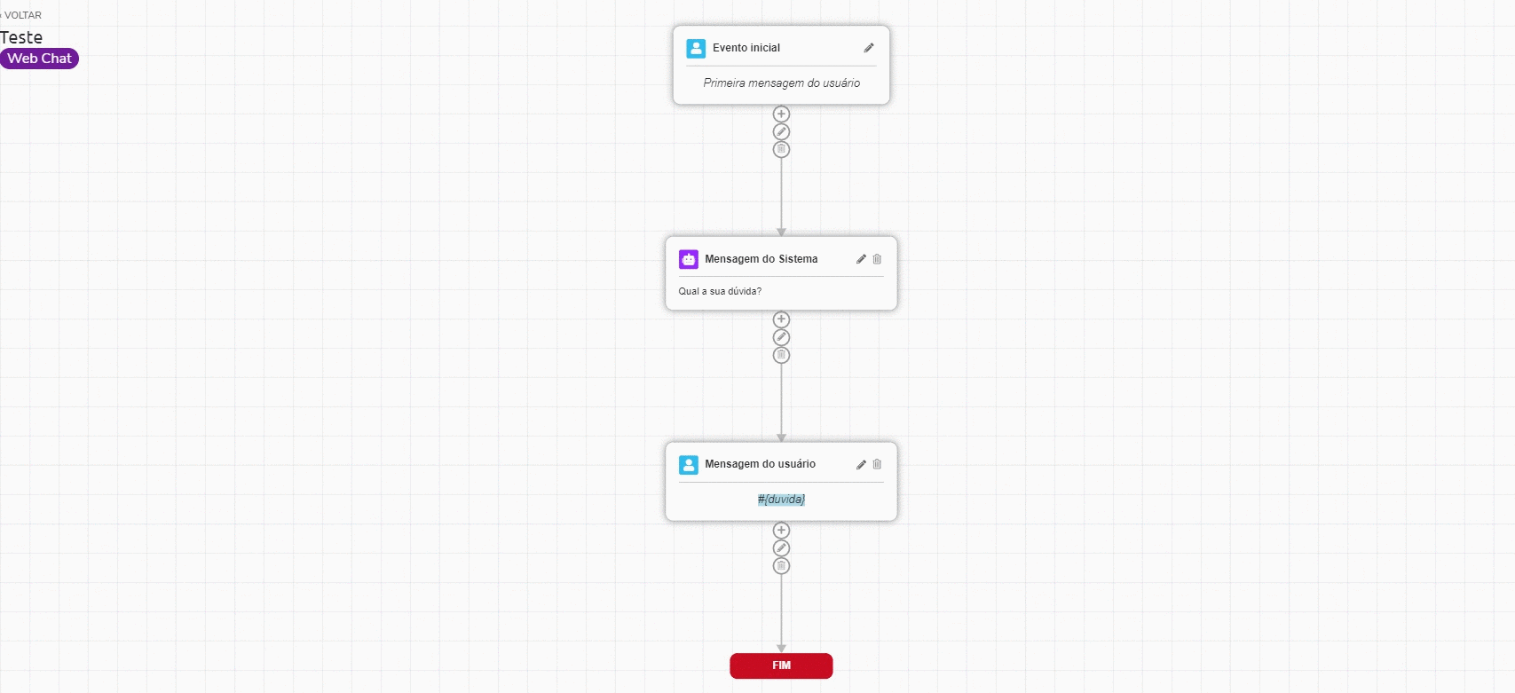 En el ejemplo siguiente, hay un escenario en el que se pregunta al usuario cuál es su pregunta y se ha incluido un temporizador de X tiempo en caso de que la pregunta no sea respondida. Si el usuario responde a la pregunta, la variable #{duvida} se completará y el flujo continuará. En caso de que se alcance el tiempo establecido, el flujo seguirá con la continuación de la y Join sin completar la variable.