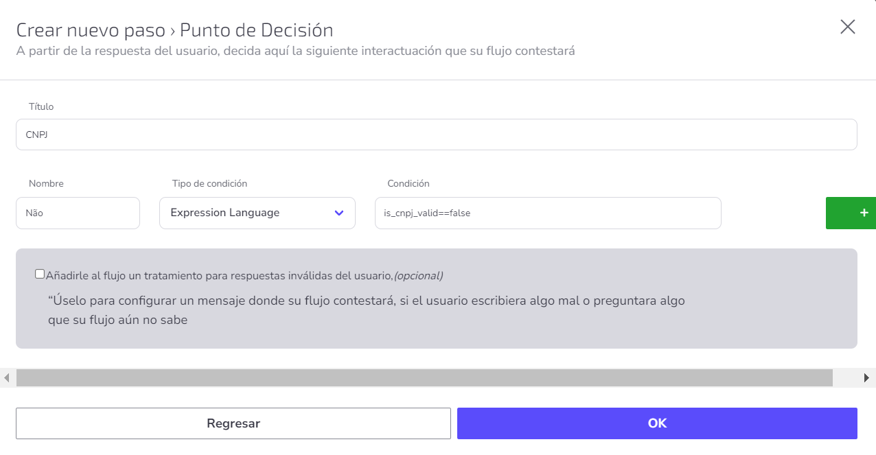 Son datos que pueden utilizarse en la continuidad del flujo, estableciendo reglas e información. Además, al utilizar el componente, no es necesario crear un Mensaje del Usuario para recopilar la respuesta, ya que el dato ya será llenado en una de las variables de salida.