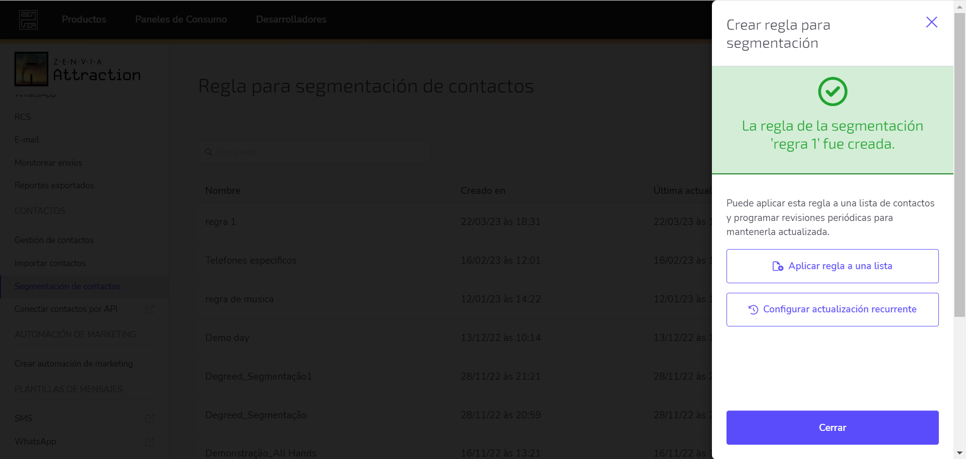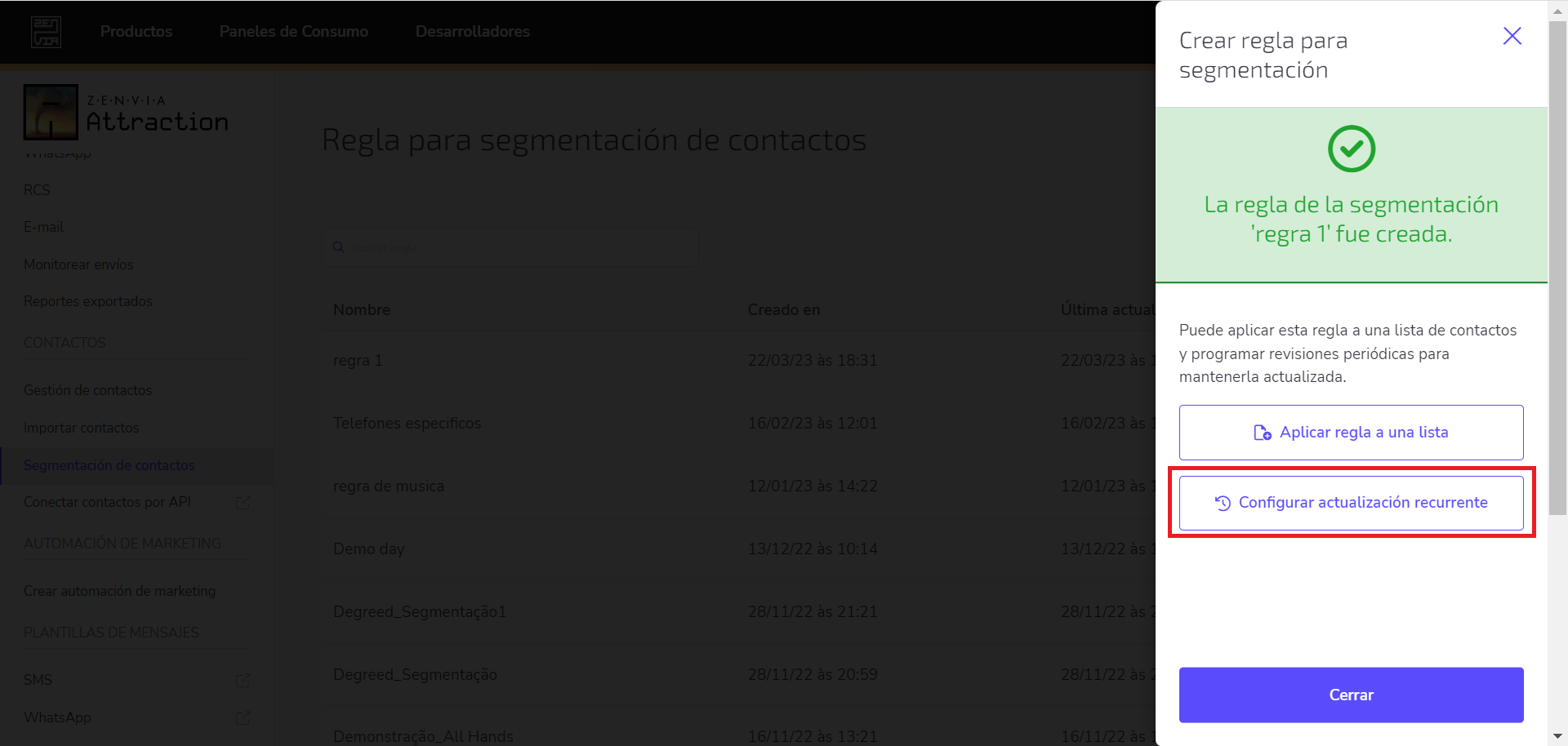 💡 Sugerencia: Reglas para segmentar contactos configuradas para ser actualizadas periódicamente también pueden ser asociadas a una regla de comunicación.