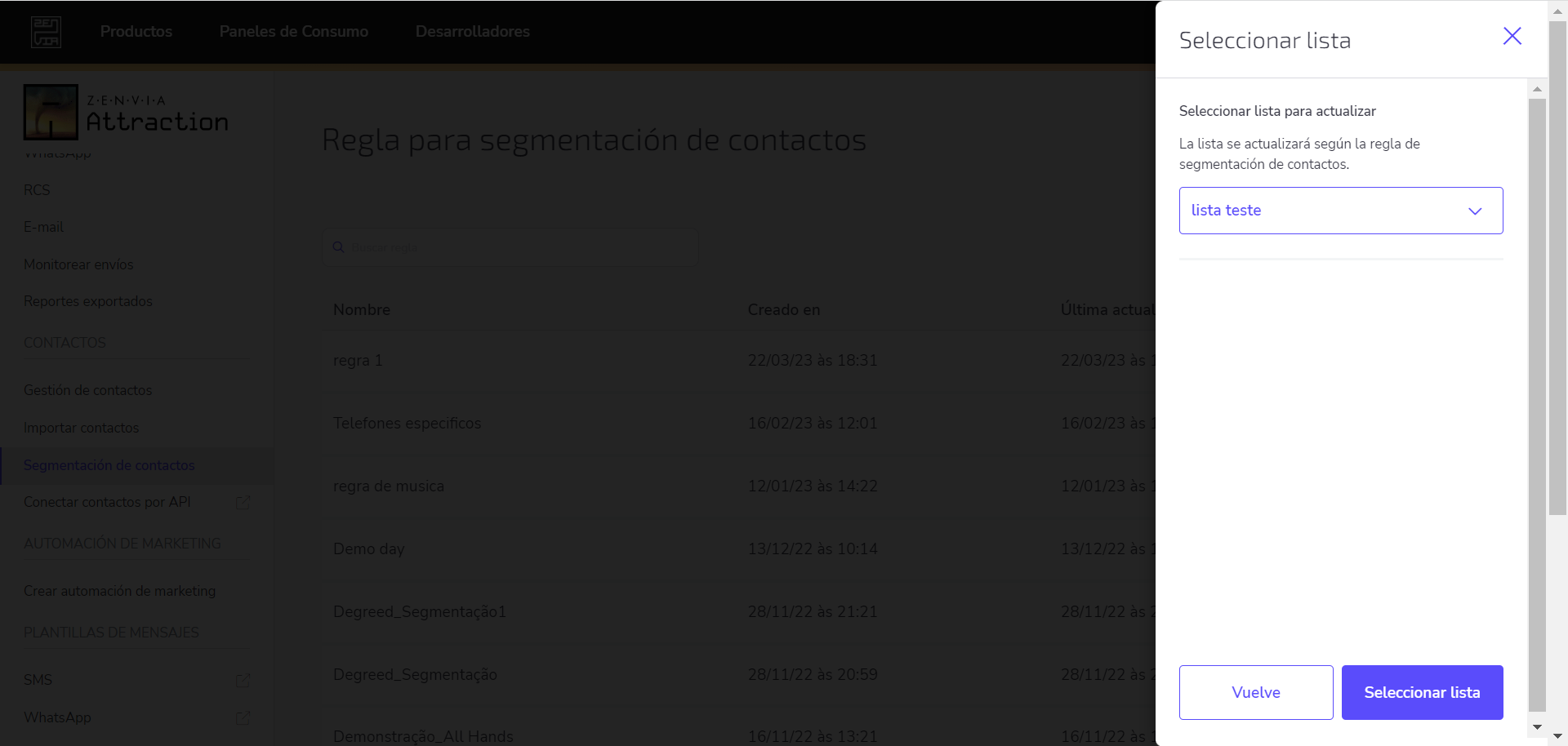 Ahora, selecciona una lista para actualizar de acuerdo con la regla para segmentación de contactos. Puedes seleccionar una lista existente o crear una nueva. Elige la opción que deseas y haz clic en Seleccionar lista.