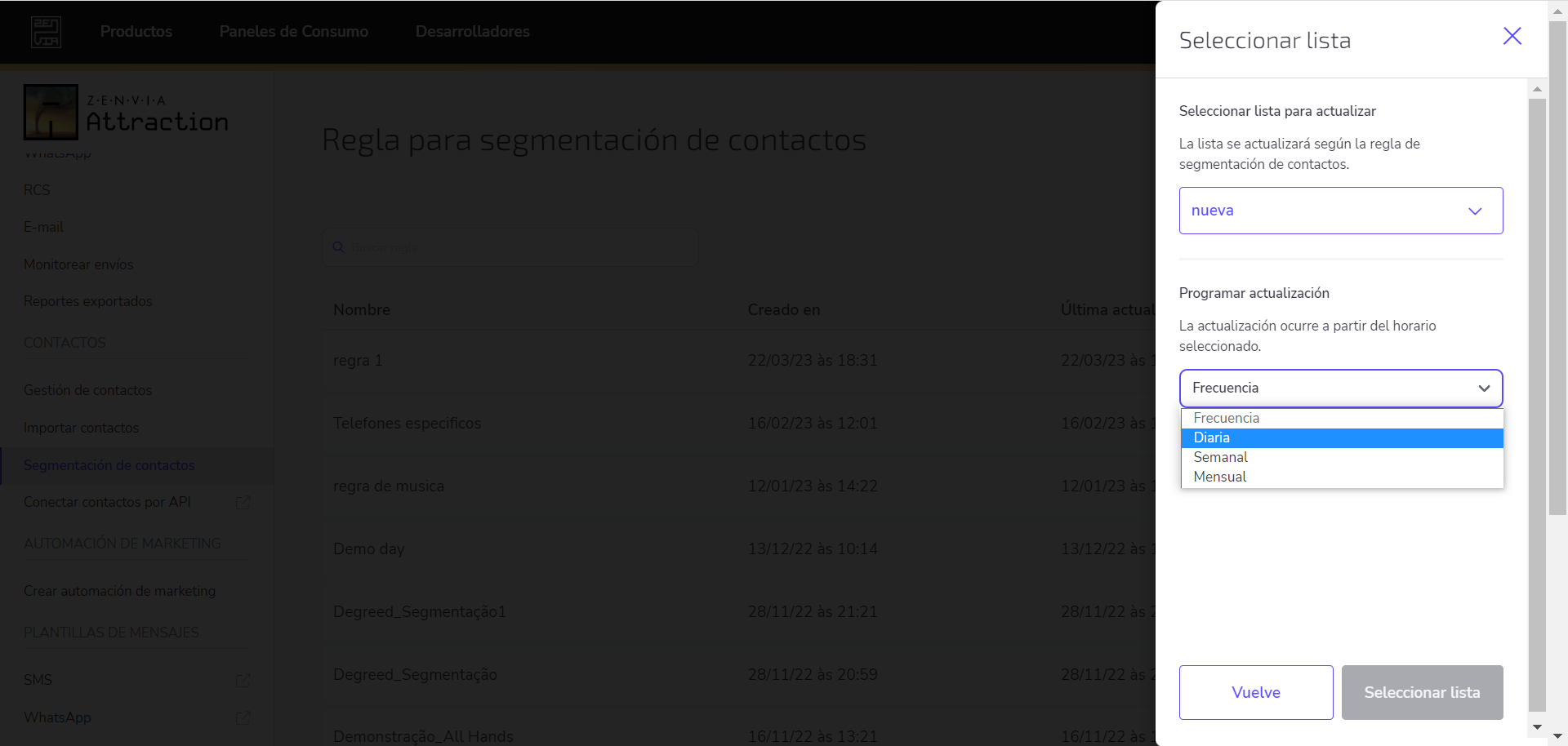 💡 Sugerencia: Reglas para segmentar contactos configuradas para ser actualizadas periódicamente también pueden ser asociadas a una regla de comunicación.
