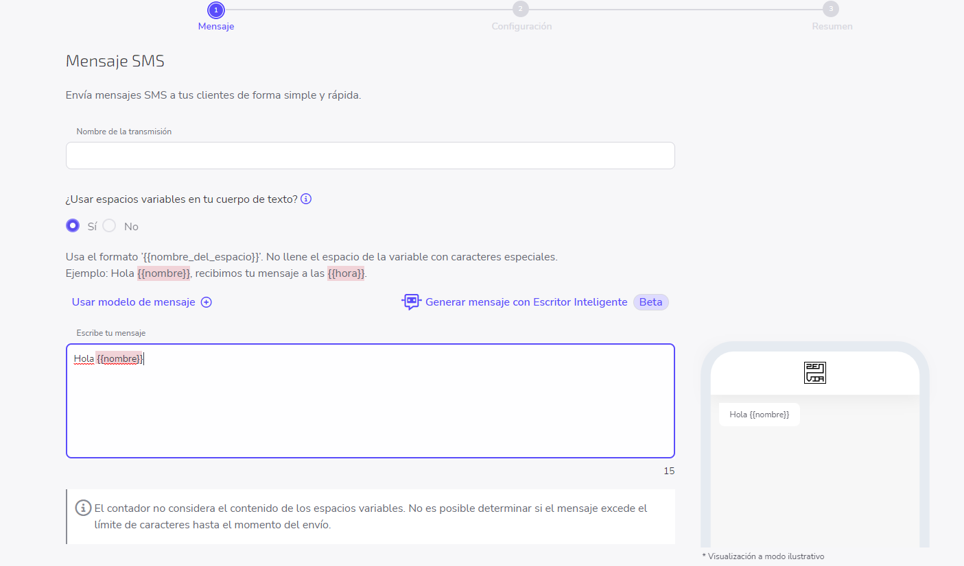 El uso de variables en el mensaje no permite un conteo exacto del número de caracteres, pues son procesadas en la etapa de Configuración del envío de la campaña.