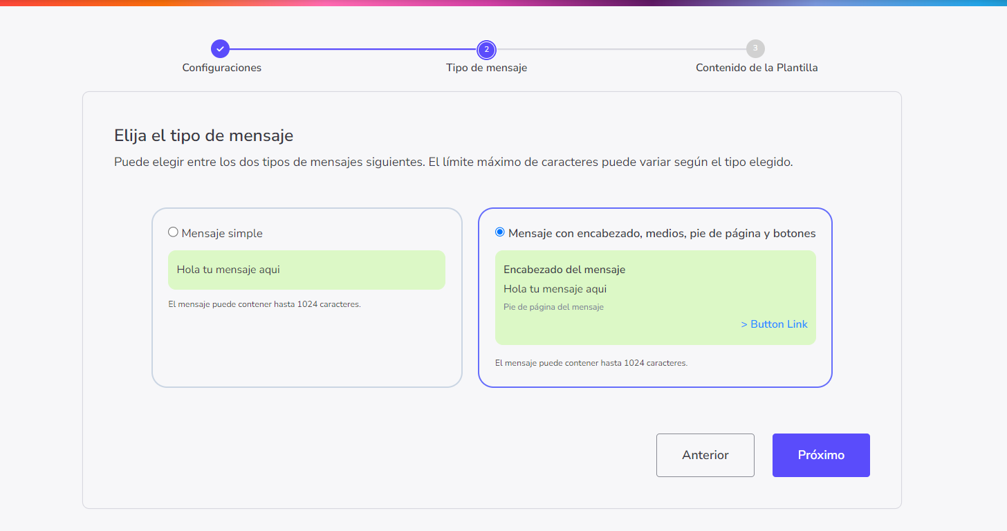 Paso 2 - Tipo de mensaje: para crear plantillas con archivos multimedia, selecciona la opción Mensaje con encabezado, multimedia, pie de página y botones.