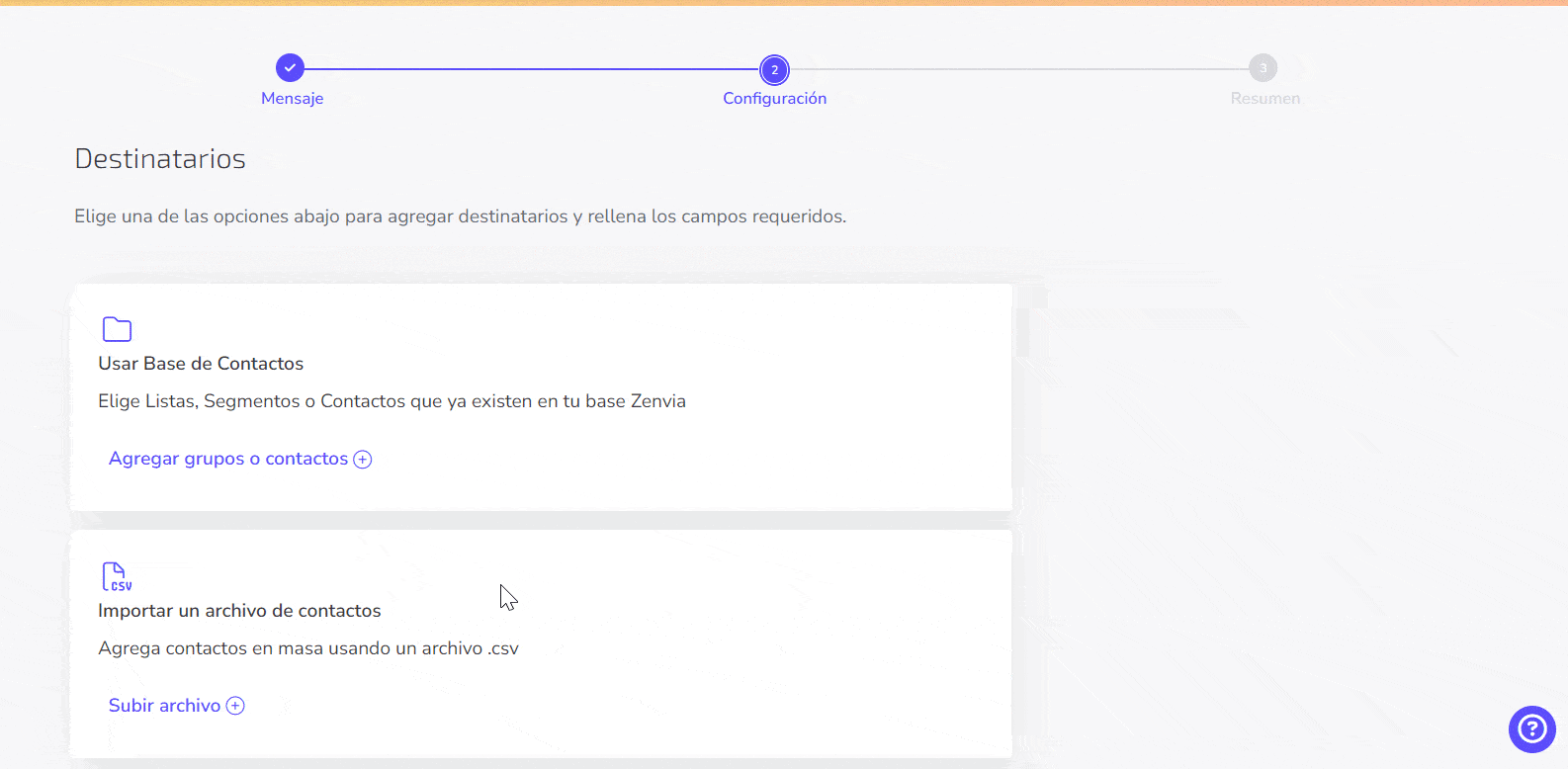 Paso 2 - Configuración: añade los destinatarios. Puedes usar una base de contactos o importar un archivo. En el ejemplo, importaremos un archivo.