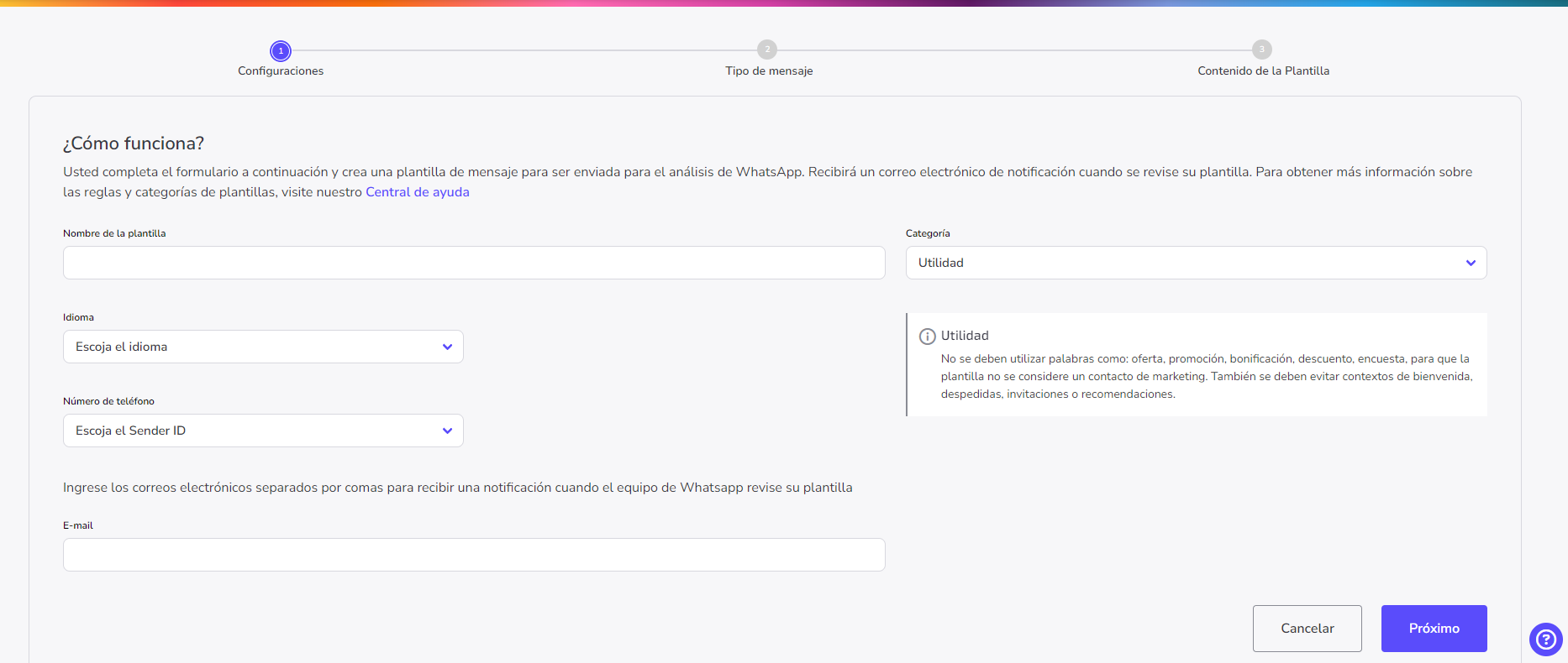 Paso 1 - Configuración: da un nombre a la plantilla, selecciona la categoría, el idioma y el número de teléfono, y finalmente ingresa un correo electrónico para ser notificado cuando tu modelo sea revisado por el equipo de WhatsApp.