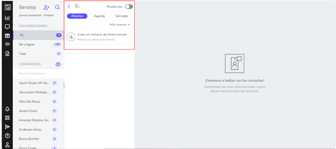 La Bandeja de entrada es donde se muestran todos los mensajes enviados y recibidos de sus contactos que esperan atención y se divide en secciones: Tú, No asignados, Todos y Compañeros.