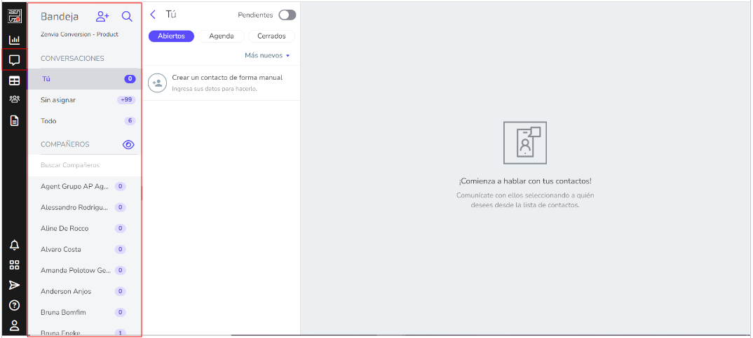 La Bandeja de entrada es donde se muestran todos los mensajes enviados y recibidos de sus contactos que esperan atención y se divide en secciones: Tú, No asignados, Todos y Compañeros.