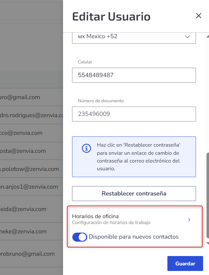 - Disponible para nuevos contactos: Controla si el usuario debe recibir nuevos contactos automáticamente. Si está desactivado, el usuario sigue teniendo acceso al sistema y puede continuar con los contactos que ya tenía, pero no recibirá nuevos leads.